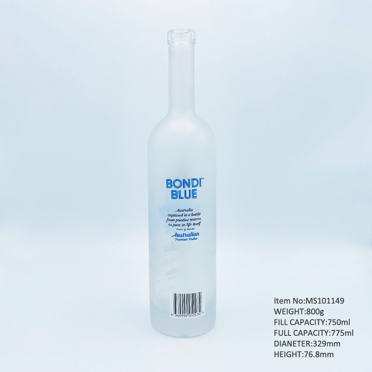 750ml vodka glass bottle this is a customized spirits bottle. through frosting and decals to make the bottle a perfect Custom distilled spirits bottles, that can hold different Liquor,such as gin, agave,brandy,vodka whiskey, rum and other types of wine.Cork stoppers can choose different styles.